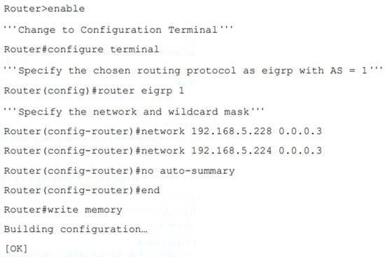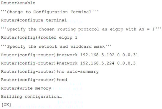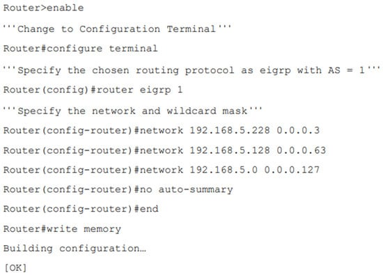 EIGRP version 2 was configured on all routers to enable dynamic routing within the network. EIGRP facilitated efficient path selection and routing table updates as the network topology changed. The various configuration settings for Router0, Router1, and Router2 are as shown in Figure 8, Figure 9 and Figure 10, respectively. The Autonomous System (AS) number for all routers was set to 1 while for each network, the Wildcard Mask was calculated by subtracting each octet of the Subnet Mask from 255 as shown in Table 6.