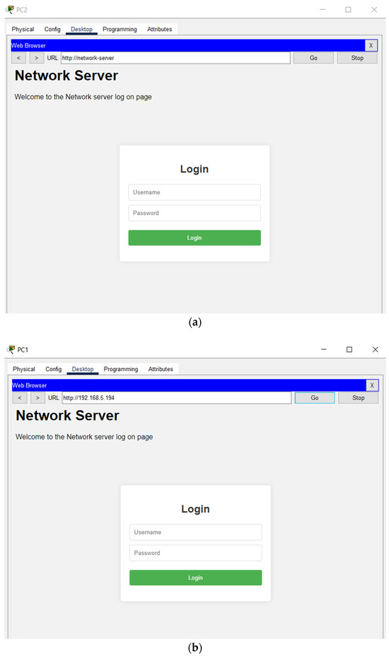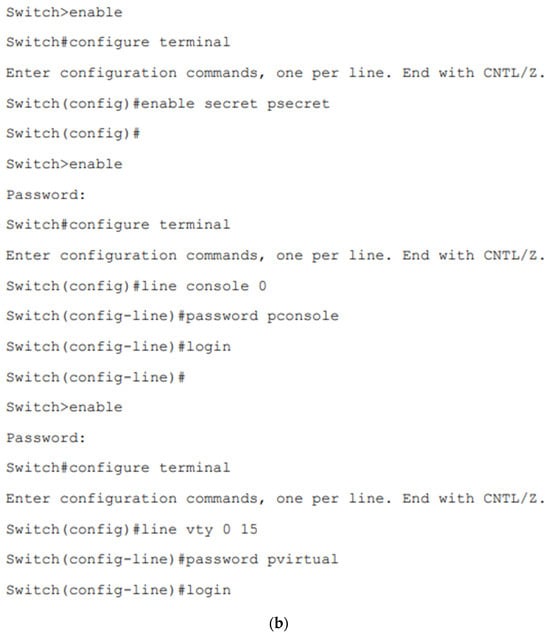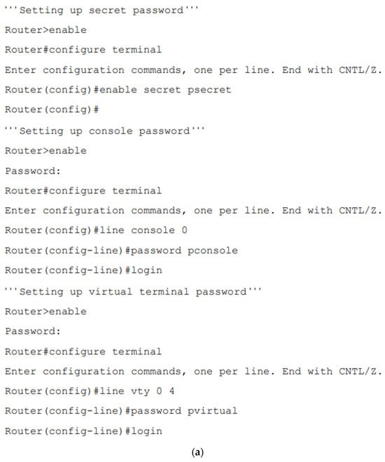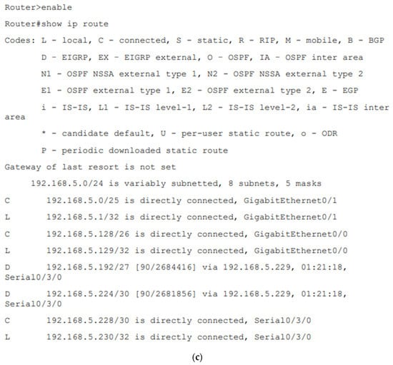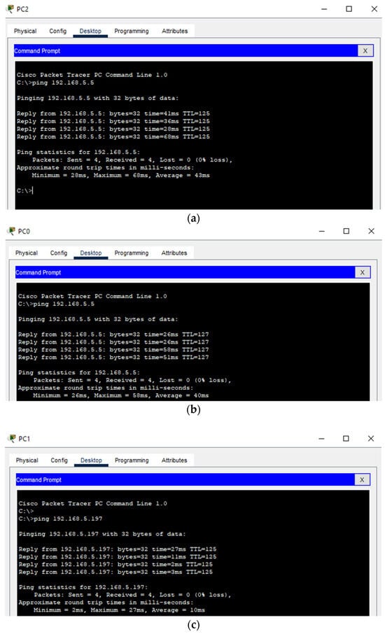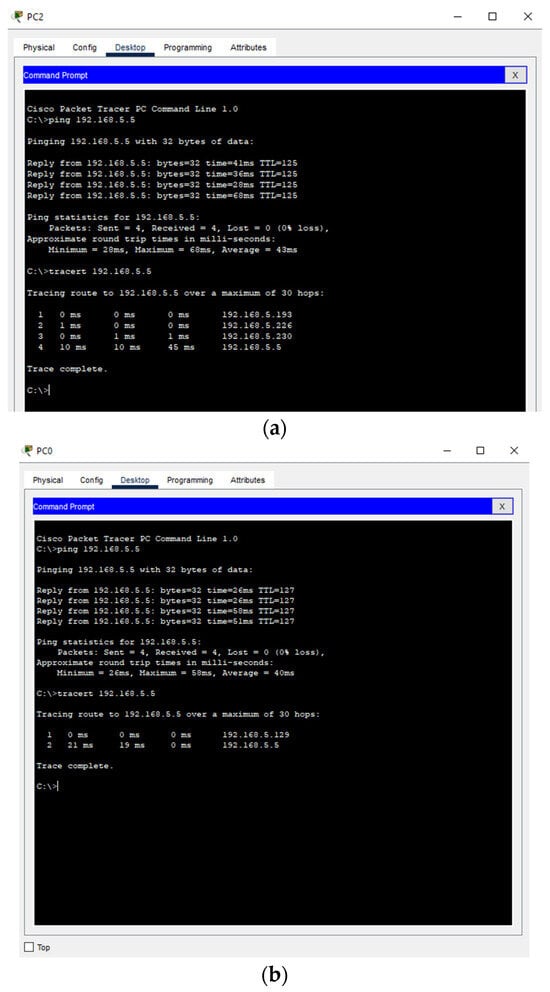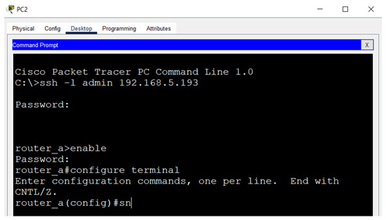 In this paper, Telnet was used to remotely access, configure, and manage devices (set password on each Router) on the network through a CLI. Telnet and SSH protocols are appropriate for private and public networks, respectively. SSH is a robustly secure replacement for Telnet, used to enable remote access and management to a device. Unlike Telnet that encrypts only usernames and passwords, SSH encrypts all data transmitted across the network preventing such data from eavesdropping and unauthorised modification. SSH operates on a client–server architecture. In our context, the client is the PC or Router/Switch from which the connection is to be established whereas the Server is the Router or Switch to which the configurations may be made. With SSH implemented, only authorised users with credentials will be able to make modifications on the Switch or Router after they have been authenticated. The configuration of SSH requires that the server has a hostname, and domain name as both the hostname and domain name are required for the generation of encryption keys for encrypting traffic exchanged between the client and server. In our work, we demonstrated the implementation of SSH to access a Router from PC2 as shown in Figure 19. Once configured, the router can be tested by typing the following commands on PC2.