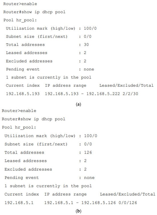 - Ramprasad, R.; Narayanan, J.; Balaji, D.; Kishor, S. A DHCP Based Approach To IP Address Management And Allocation In A Network Using VLSM. In Proceedings of the 2023 9th International Conference on Advanced Computing and Communication Systems, ICACCS 2023, Coimbatore, India, 17–18 March 2023; Institute of Electrical and Electronics Engineers Inc.: Piscataway, NJ, USA, 2023; pp. 882–887. [Google Scholar] [CrossRef]