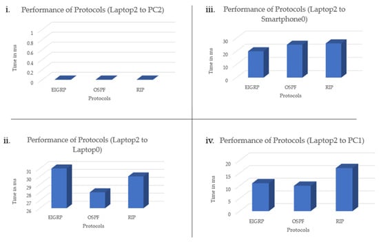 The simulation results indicate the performance of different protocols when a device connects to another host in the same subnet—Location A (Laptop2 to PC2) and to another host in a different subnet—Location B (Laptop2 to Laptop0), (Laptop2 to PC1), and Location C (Laptop2 to Smartphone0). The outcomes of the protocols are presented in Figure 17 showing the time taken (in milliseconds (ms)) to deliver packets or messages to the destination devices.
