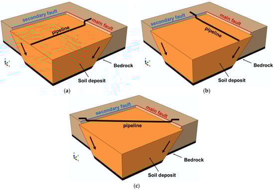 Figure 1a depicts a pipeline that perpendicularly crosses the main fault, parallel to and far away from the secondary fault. This constitutes a common case that has also been included in all seismic norms and guidelines used for the design of pipelines. On the other hand, Figure 1b shows a pipeline that is aligned parallel to the main fault but crosses a secondary fault. This constitutes a realistic scenario in engineering practice where a pipeline is aligned parallel to an active tectonic fault in order to prevent crossing it without properly assessing the presence and potential impact of secondary faults. Although this pipeline routing is hypothetically safer, recent studies by the authors’ group revealed that in such cases, the pipeline may even have the same risk as if it intersected the main fault [52,53]. Lastly, Figure 1c illustrates the potential scenario in which a pipeline crosses both the main and the secondary fault. It should be noted that in such cases, the design standards (e.g., Eurocode 8 [27]) suggest that a suitable intersection angle of the pipeline with the (main) fault should be chosen in order to minimize pipe distress. Nonetheless, the norms and engineering practice usually ignore the potential presence of secondary faulting and its consequent impact on the pipeline.