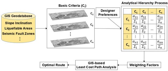 In applications such as the optimal route selection of CI, where, according to Allen [4], approximately 70% of a project’s financial administration and resource allocation are based on geospatial information, GIS offers a valuable solution that overcomes the aforementioned limitations of traditional methods and mathematical models. Furthermore, GIS provides the Least-Cost Path Analysis (LCPA) method, which utilizes a series of sophisticated geoprocessing tools to identify the most cost-effective route on a given cost surface between specified starting and ending points [5].