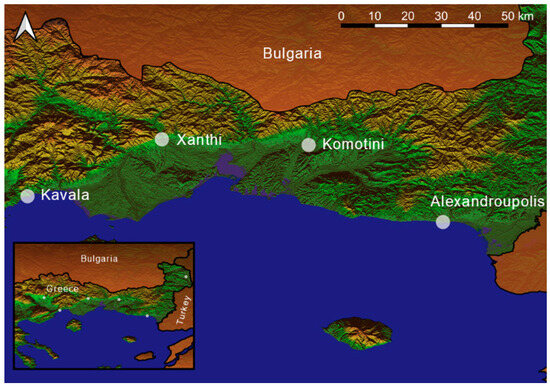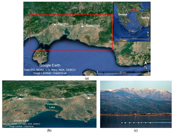 Figure 3a–c, Figure 4, and Figure 5a–c clearly demonstrate the significant interest in the examined area owing to its distinctive topography and geomorphology. Specifically, the presence of Vistonida Lake in the central part of the examined area (Figure 3a,b) indicates significant seismotectonic activity, possibly resulting from lateral and vertical movements of the Earth’s crust, which has also been documented in previous studies [69]. The seismotectonic activity is further elucidated by examining the map in Figure 5b, which highlights the dense concentration of seismic fault zones. The approximate location of seismic fault zones has been based on the findings of Mountrakis et al. [70].