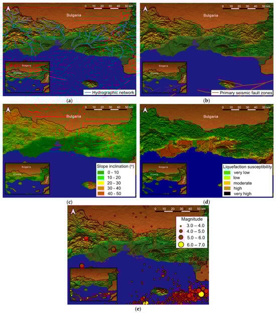 Geodata of the examined area for the application of the decision-support tool: (a) hydrographic network, (b) primary seismic fault zones, (c) slope inclination, (d) liquefaction susceptibility classes, and (e) seismicity.