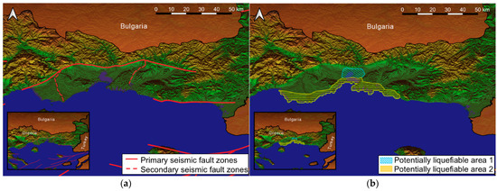 Second-order geodata of the examined area for the application of the decision-support tool: (a) secondary seismic fault zones and (b) potentially liquefiable areas.