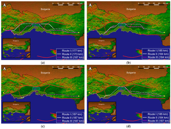 Proposed alternative routes derived after implementation of (a) scenario 1, (b) scenario 2, (c) scenario 3, and (d) scenario 4.