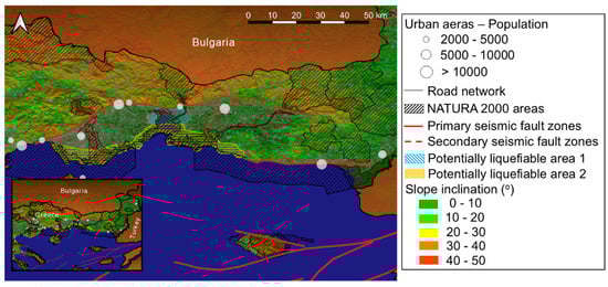 Herein, particular focus has been given to the Kavala-Xanthi-Komotini seismic fault zone, which runs adjacent to Vistonida Lake and extends for tens of kilometers in a west-east direction within the examined area [71]. In such areas, characterized by the presence of earthquake-related geohazards, a vast amount of geodata is needed to ensure reliable and accurate mapping, typically obtained via geophysical surveys and geological maps. In parallel, the examined area is characterized by a notable variation in elevation, with mountains of considerable height located just a few kilometers from sea level (Figure 3c). This fact is corroborated by the slope inclination map shown in Figure 5c, which reveals that the slope inclination ranges from 0° to 50°, with steep slopes to the north of the seismic fault zone and almost flat terrain to the south.