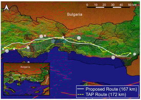 - Trans Adriatic Pipeline. Routing Report. Report CAL00-PMT-000-A-TRP-0001; Trans Adriatic Pipeline: Baar, Switzerland, 2013. [Google Scholar]