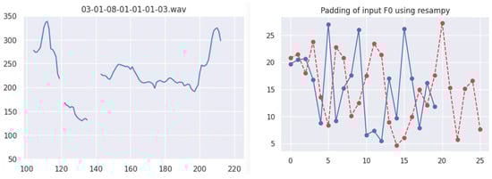 Left panel: Sample of F0 values in semitones extracted from the audio file “03-01-08-01-01-01-03.wav.” Right panel: Resampled pitch contours using the resampy function. The pitch values in semitone, which are randomly generated for an illustrative purpose, are represented by the solid line, and the resampled pitch values are represented by the dotted line. The X-axis on both panels represents frames.