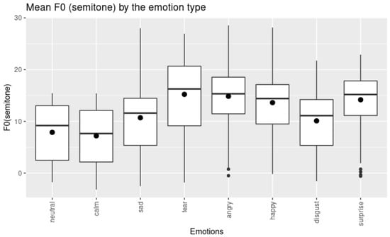 Boxplot of mean F0 (semitones) for each emotion category. The dot inside each box denotes the mean F0 for that emotion.