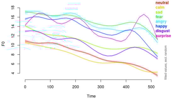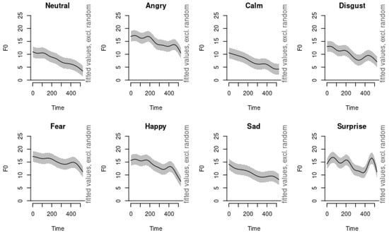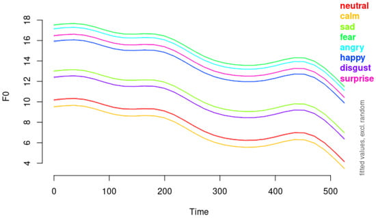 Intonation, particularly pitch contour patterns, has been recognized as important for expressing emotional states [15,16,17,18,19]. Previous works [15,16,17,18,19] have made significant contributions to enhancing our understanding of the role of F0 in emotional speech. However, previous studies often used simplistic intonation parameters, which may contribute to lower classification rates of emotional types based on acoustic features [8]. Simplifying dynamic data can reduce the data size and make traditional statistical methods easier to apply, but it may also lead to the loss of potentially interesting patterns [20]. Some studies, such as [15,19], have modeled F0 dynamics in emotional speech. But the previous approaches had a limitation in allowing us to evaluate not only the general trends of F0 contours but also their interaction with speaker-specific variability and temporal effects.