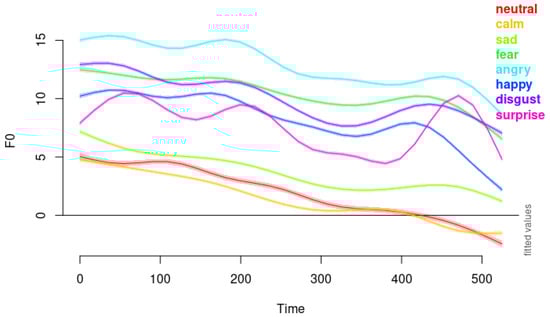 Figure 4 illustrates the modeled F0 contours over time for each emotion, as estimated using Model 2.