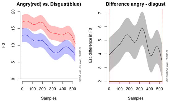 The right panel of Figure 7 illustrates the estimated difference in the F0 between the angry and disgust conditions, along with the confidence interval of the difference. This visual comparison highlights that while the dynamic patterns of pitch movement are similar for both emotions, the overall pitch level serves as a distinguishing feature. The elevated pitch levels associated with anger support the notion of increased arousal and intensity in this emotion, which is reflected acoustically.