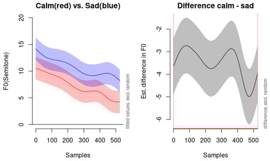 As illustrated in Figure 8, the left panel displays the fitted pitch contours for calm (red line) and sadness (blue line) over 500 samples. Both contours demonstrate a similar downward trend, but the pitch level for sadness remains consistently higher than that of calm. The shaded areas represent the confidence intervals excluding random effects, showing the reliability of these observations. The right panel of Figure 8 presents the estimated difference in the F0 between the calm and sad conditions, with the shaded area indicating the confidence interval of the difference. The fact that the confidence interval does not cross zero throughout the entire time window (0 to 525 samples) suggests that the difference in pitch level between calm and sadness is statistically significant across the utterance. These findings highlight the similarities between calm and sadness in terms of pitch contour shape: both exhibit a downward slope indicative of low arousal. However, the differences in the overall pitch level provide an acoustic cue for distinguishing between the two emotions. The higher pitch in sadness may reflect a slight increase in emotional intensity or a different emotional valence compared to calm.