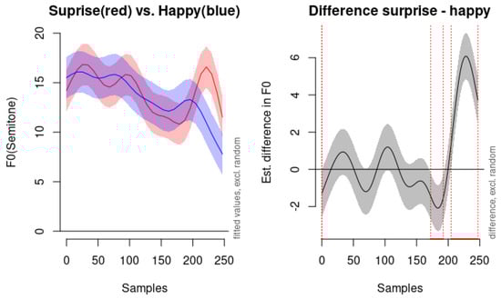 The left panel of Figure 9 demonstrates the fitted pitch contours for both emotions. While both happiness and surprise start at similar pitch levels, their trajectories diverge significantly over time. Happiness maintains a relatively steady pitch before descending sharply, whereas surprise exhibits considerable fluctuation and culminates in a pronounced pitch increase at the end. The right panel of Figure 9 highlights the estimated difference in the F0 between the two emotions. The areas where the confidence interval does not cross zero indicate time windows where the difference in pitch is statistically significant. These differences suggest that listeners may rely on the distinctive pitch patterns, particularly the end-of-utterance elevation in surprise, to differentiate it from happiness.