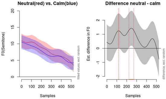 Figure 10 illustrates the modeled F0 contours and differences between neutral and calm emotions. The left panel displays the fitted pitch values in semitones over 500 samples, with shaded areas representing the confidence intervals, excluding random effects. The contours for neutral (red line) and calm (blue line) are nearly overlapping, indicating highly similar pitch patterns. The right panel shows the estimated difference in the F0 between the neutral and calm conditions, with the shaded area indicating the confidence interval of the difference. The vertical red dots mark the brief time windows where the difference is statistically significant.