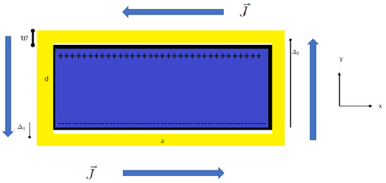 A cross-section of the relativistic engine. The charged capacitor is painted in blue, the coil is painted in yellow. is the current density in which the arrows show its direction of flow, d is the distance between capacitor plates, a is the x dimension of the capacitor, w is the coil’s width, is the distance between the lower capacitor plate and the middle of the lower coil winding, is the distance between the lower capacitor plate and the middle of the upper coil winding.