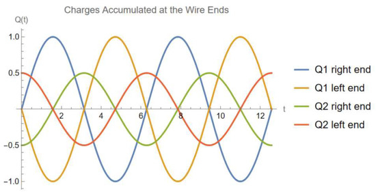 If we have , then the charges at the wire ends will follow a periodic temporal behavior, as depicted in Figure 5: