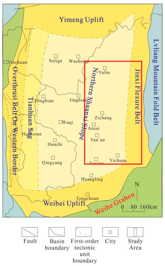 The Ordos Basin is located at the junction of China’s Inner Mongolia Autonomous Region and Shaanxi Province. It is one of the largest continental basins in China and an important oil and gas resource area in China. The Ordos Basin is located in the southwest of the North China plate. It can be further divided into six first-order tectonic units: Yishan slope, Yimeng uplift, Jinxi fold belt, Weibei uplift, Tianhuan depression, and western margin thrust belt (Figure 1). It is a stable craton basin dominated by overall uplift and subsidence, with a total area of about 25 × 104 km2. In the early Paleozoic, the northern margin of the Ordos Basin is the Paleo-Asian Ocean, the southwestern margin is the Qinqi Ocean, and the central and eastern parts are the North China Sea. The basin has the characteristics of a relatively stable interior and strong edge activity [33,34,35]. In the early Ordovician, the North Qinqi Ocean, a branch of the Proto-Tethys Ocean, subducted to the Ordos Plate, resulting in the southwest margin of the Ordos Basin gradually shifting from tension to compression under the tectonic force. In the middle and late Ordovician, the North Qinqi Ocean gradually disappeared into an orogenic belt, and the South Qinqi Ocean began to expand. At this time, the southwestern margin of the Ordos Basin was under the action of compressional structure, and the southwestern margin of the basin gradually evolved into a residual ocean basin and developed a back-arc basin.