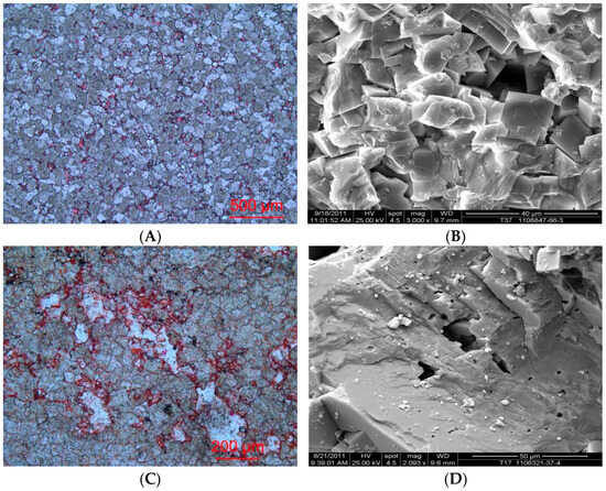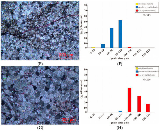 The intergranular pores and intergranular dissolved pores of dolomite are mainly formed in the same period of dolomitization in carbonate sediments, which are closely related to the genesis of dolomite. The reservoir rocks of this type of reservoir are mainly coarse powder crystal and grain dolomite with a mud powder crystal structure. The grain size of dolomite is generally 40–150 μm, and the grain structure is relatively uniform. The reservoir space type of the intergranular pore-type reservoir of dolomite is mainly dolomite intergranular pores (locally developed intergranular dissolved pores at the same time), followed by microfractures. The intergranular pores and intercrystalline non-selective dissolutions of dolomite are mainly formed in the same period of dolomitization of carbonate sediments, which is closely related to the genesis of dolomite (Figure 3A,B). The pore wall is straight and smooth, and the pore size is generally 9–50 μm for the intergranular dissolved pores (Figure 3C,D). The pore size is generally 30–200 μm, unevenly distributed, and the size is very different. Its development degree depends on the rock structure and the strength of its dissolution. The intergranular pores are transformed by the later karstification, forming intergranular pores of composite genesis. In addition to some of these pores being filled and destroyed by calcite and dolomite, most of them are effective pores. The pore size is generally 2–15 μm, and the surface porosity is generally 0.5–3.5%. After the late flood dissolution, the edge of intergranular pores has estuarine dissolution marks and the shape is irregular, which will expand to form intercrystalline non-selective dissolution. This kind of pore has good connectivity and the highest development frequency, so it is the best type of reservoir space in the region.