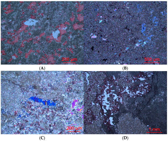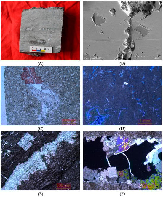 Crystal-selective dissolutions are also referred to as crystal-selective dissolutions (Figure 4D–F). The number of halite crystal selective dissolutions is far less than that of columnar and needle-like gypsum crystal selective dissolutions. The pore morphology is relatively regular, and the size is mostly between 0.3 and 0.6 mm. When there is local filling, it is mainly filled with calcite, followed by dolomite and a small amount of authigenic quartz (Figure 4E). The long axis of the pores is 0.3–0.5 mm, the short axis is 0.02–0.05 mm, and the pore length/width ratio is generally greater than 0.1. When there is local filling, it is mainly filled with calcite, followed by authigenic quartz (Figure 4D,F). This kind of pore has good reservoir performance, but it is less developed in the region. The selective dissolutions can increase the porosity of the reservoir and form additional oil storage space.