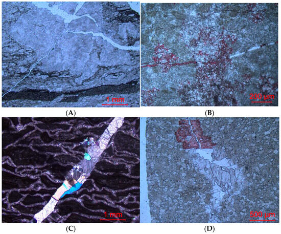 Fractures are often developed in brittle dolomite. Dissolved fractures are formed by the chemical dissolution of limestone or cement inside microfractures in rocks through dissolution in the later diagenesis, which extends and widens microfractures. The width of the fracture is 0.03–0.1 mm, and the maximum can reach 0.5–1 mm. Fractures can significantly increase the effective porosity and permeability of the reservoir, change the flow path of the fluid in the reservoir, form a complex flow network, provide a more convenient flow channel for the fluid, and thus improve the efficiency of oil and gas recovery. Most of the structural fractures formed in the early stage are filled with calcite or dolomite, and most of the structural fractures formed in the late stage are not filled, showing an open–semi-open shape. The fracture surface is not straight and is mostly serrated (Figure 6).