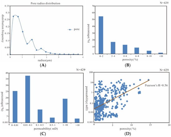 Histogram and correlation chart of porosity and permeability. (A) Pore radius distribution. (B) Porosity histogram. (C) Permeability histogram. (D) Correlation diagram of porosity and permeability.