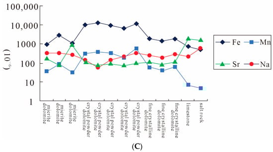 Sr is an important trace element in carbonate rocks, and the content of Sr increases gradually from shallow water to deep water. Since the contents of Sr, Na, and Mg in atmospheric precipitation are lower than in seawater and the contents of Mn and Fe in atmospheric precipitation are higher than in seawater, the deposition of dolomites usually leads to a reduction in the content of Sr, Na, and Mg in the quality of atmospheric precipitation. And there is an increase in Mn plus and Fe. Moreover, the form of Mn is relatively stable and accumulates in deep water, so the Mn content gradually increases from shallow water to deep water. The Na content often reflects the salinity of diagenetic fluid.