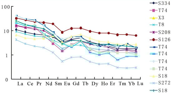 Ce and Eu are variable valence elements when the system conditions change. The results of the rare earth element analysis of dolomite in the study area are shown in Table 2. The content of rare earth elements is 0.01 × 10−6–21.8 × 10−6, which has the characteristics of low rare earth element content in typical carbonate rocks. The data of rare earth elements in this study were standardized by chondrite (Figure 9). It can be seen from the figure that the standardization mode of rare earth elements chondrite is inclined to the right as a whole, with light rare earth element enrichment and heavy rare earth element loss. There is a significant valley value at Eu, δEu = 0.52–0.95 (Figure 10), with an average value of 0.64, which is a loss type, reflecting the low temperature and alkaline environment. Ce shows a weak valley value, δCe = 0.86–0.98 (Figure 10), and the average value is 0.94, indicating that the diagenetic environment is a reducing environment, reflecting that this type of dolomite is buried.