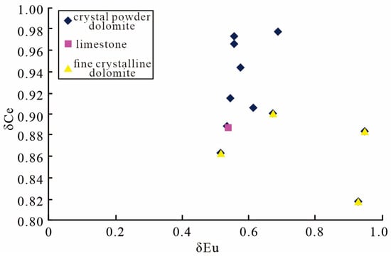 Cross-plot of δCe and δEu of dolomite in the fifth member of the Majiagou Formation, the Ordos Basin.
