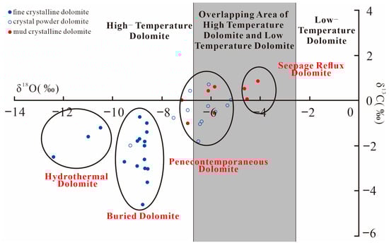 The C isotope of carbonate rocks is mainly related to the fluid and mixing of different carbon sources, while the O isotope is a function of fluid properties and temperature, which is more sensitive to temperature to some extent. The results of C and O isotope analysis in the study area are shown in Figure 11. The test results show that the seepage reflux dolomite is located in the overlapping area of high temperature and low temperature. The content of δ13C is between 0‰ and 2‰, and the content of δ18O is between −4‰ and −6‰, which is a near-surface marine environment. The δ13C content of the penecontemporaneous dolomite is between −2‰ and 2‰, and the δ18O content is between −6‰ and −8‰, which is a shallow burial environment. The δ13C content of buried dolomite is between 0‰ and −4‰, and the δ18O content is between −8‰ and −10‰, which reflects a shallow–medium burial environment. The δ13C content of hydrothermal dolomite ranges from 0‰ to −2‰, and the δ18O content ranges from −10‰ to −12‰. The severely negative δ18O content is the burial environment [46,47,48].
