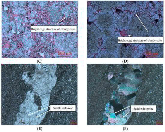 In the genetic model of hydrothermal dolomite, hydrothermal dolomite is often developed near the tensional fault. The deep thermal fluids provide a material basis for the formation of dolomite and also cause the dissolution of the surrounding rock, which increases the porosity of the original rock and is conducive to the development of high-quality reservoirs. Hydrothermal dolomite is generally characterized by saddle dolomite, which can be used as cement to fill holes or metasomatic. Moreover, saddle dolomite is often associated with quartz, pyrite, calcite, and other minerals. During the growth of dolomite crystals, microfractures on the crystal surface are developed. The crystal lattice is distorted during the crystal growth process, and the microfractures on the crystal surface are developed (Figure 12E,F).