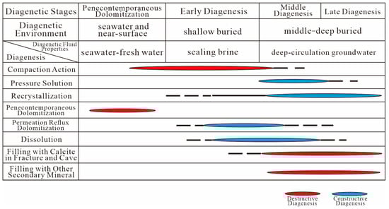 The diagenetic evolution sequence refers to the sequence of various diagenesis processes. According to the research, some diagenesis can occur in different diagenetic stages, such as dolomitization and karstification, which can occur not only in the same diagenetic stage but also in other diagenetic stages. In this case, the diagenetic changes in rocks caused by different diagenesis in the non-diagenetic stage have different characteristics. Diagenetic stages can be divided according to various diagenesis processes and the resulting diagenetic mineral assemblages and structural changes [49,50,51]. Figure 13 shows the influence of the main diagenesis on pore evolution in the fifth member of the Majiagou Formation in the study area systematically and vividly. The diagenetic evolution sequence from the penecontemporaneous period to the middle–deep burial period is penecontemporaneous dolomite, anhydrite dissolution → seepage silt filling, freshwater dolomite, calcite, and gypsum filling, pressure solution compaction, calcite partial dissolution → gypsum filling, karst cave, buried hydrothermal dolomite, dolomite partial dissolution → calcite complete dissolution, pore dissolution expansion, and quartz pyrite filling. Recrystallization and compaction pressure solution affect the reservoir to varying degrees from the near-surface shallow burial period to the middle–deep burial period.