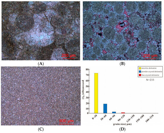 Based on previous research [45] and the microscopic observation and identification results of a large number of dolomite slices in the Majiagou Formation in the study area, the dolomite in the study area can be divided into syndepositional or metasomatic residual oolitic dolomite, secondary metasomatic or recrystallized micritic dolomite, powder crystal dolomite, and fine crystal dolomite. The residual oolitic dolomite is gray-brown gray, and the particles are powder–fine crystal structures. The content of residual particles is about 65–80%, mainly algae debris, followed by sand debris, with different sizes. The largest one can reach 0.5 mm2. It can be seen that the edge of the bay is filled with micritic dolomite and fine powder crystal dolomite (Figure 2A,B). The micritic dolomite (Figure 2C,D) sometimes develops bioturbation structures. The mud content is generally 5–30%. The common sedimentary structures are horizontal algae lamina and micro-wave lamina, and the bird’s eye structure formed by dissolved soluble minerals can be seen locally. The powder crystal dolomite size is 0.06–0.1 mm, mainly with a powder crystal structure (Figure 2E,F). Some developed bioturbation structures, discontinuous horizontal textures, and irregular mud layers can be seen locally. Intergranular dissolved pores, fractures, and sutures are developed but are filled with calcite and gypsum. This kind of dolomite is often developed under gypsum salt, which may be related to the seepage reflux of high-salinity brine and then the experience of the later burial recrystallization transformation. The fine-grained dolomite grains are mainly dolomite replaced by limestone and biological debris, with a particle size of about 0.1 mm (Figure 2G,H).