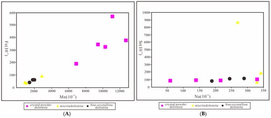 The content of Fe and Mn in powder crystal dolomite is obviously higher than that of other lithologies. The content of Fe is between 6888 × 10−6 and 12,761 × 10−6, with an average of 10,116.4 × 10−6, and the average content of Mn is 361.2 × 10−6. It can be seen that the content of Fe and Mn is much higher than that of mud crystal and fine crystal dolomite. The average value of the Na content is 177.32 × 10−6, and the average value of Sr is 91.1 × 10−6. The abnormally low value of the Sr content also indicates that Sr has a loss phenomenon with the diagenesis under burial conditions, indicating that the powder crystal dolomite dolomitization is mainly caused by burial. The content of Fe, Mn, Sr, and Na in fine-grained dolomite is similar to that of micritic dolomite, but the content of Sr and Na is relatively low, which is similar to that of powder dolomite, reflecting the shallow–medium burial environment.
