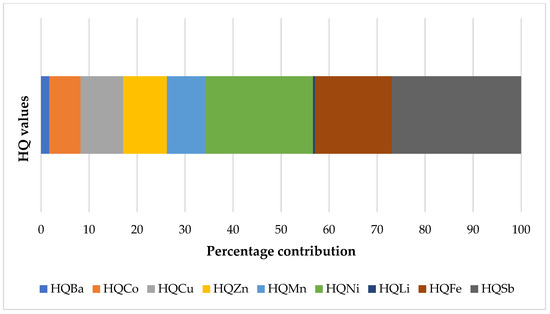 Based on the individual HQ values, the hazard index (HI) was estimated to assess the cumulative risk of exposure to all heavy metals analyzed in this study. This parameter was estimated using Equation (4).
