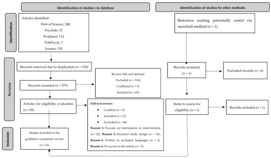 Out of the 534 articles obtained in the search, 155 duplicates were excluded, leaving a total of 379 articles. After reviewing titles and abstracts, 65 articles were selected, while 314 articles were excluded for reasons such as being written in languages other than English, Spanish, or Portuguese, focusing primarily on medical or biological aspects with insufficient attention to psychological dimensions, and/or being theses or final projects. Among the 65 pre-selected articles, a thorough reading of the full text resulted in the final selection of 21 articles. A total of 44 articles were excluded for reasons such as lack of full-text access, focusing on interventions or quality of life measurement tools rather than their impact, or having designs that were not suitable for our research (e.g., studies that divided relevant aspects into completely separate sections and cited multiple studies for each).