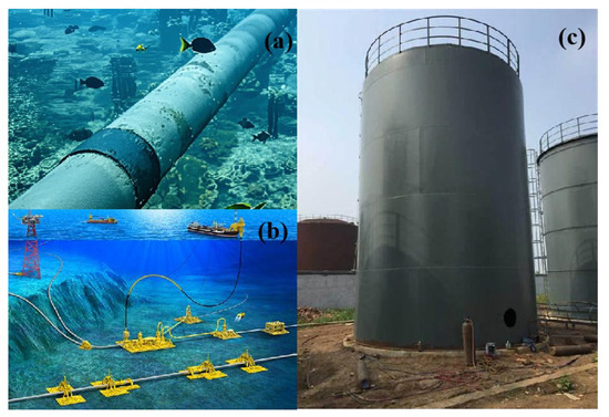 Examples of near-wall cylindrical structures in engineering practices. (a,b): deep-water pipeline system; (c): flat-bottomed ground-supported silos.