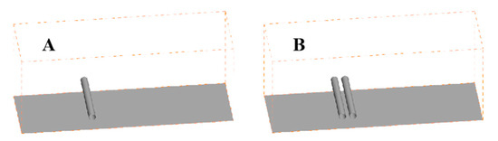 Three-dimensional schematic diagram of the investigated model. (A): an isolated cylinder; (B): two inline cylinders.