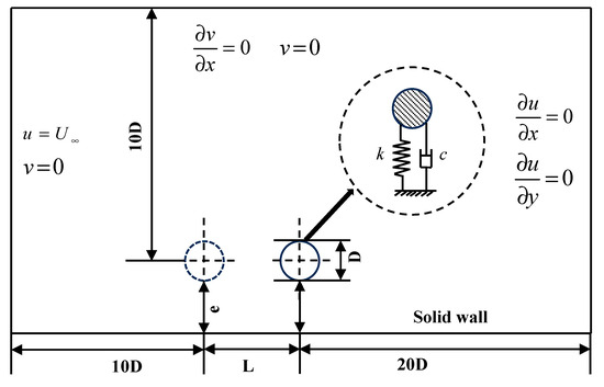 The calculation settings in this paper are simplified from the deep-water pipeline system on the seafloor. The schematic diagram of the computational model for VIV of two inline cylinders is illustrated in Figure 4. It can be seen in the figure that the whole domain is in the streamwise direction and in the transverse direction. The inflow boundary is upstream and the outflow boundary is downstream, which is consistent with the setup of a vibrating cylinder colliding with a rigid wall in Kumar and Sarkar’s work [16]. The top boundary is located at above the center of the cylinder.