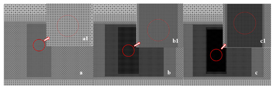 Local regions of the coarse, medium, and fine mesh. (a,a1): coarse mesh and its local magnification; (b,b1): medium mesh and its local magnification; (c,c1): fine mesh and its local magnification. The circles in the figures represent the cylinder surface and the arrows mean that Figures (a1–c1) are the corresponding local magnification of Figures (a–c).