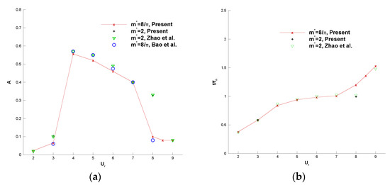 The time-averaged amplitudes , lift coefficients , and Strouhal number are listed in Table 1. The computational time per time step by using the service with Intel Xeon (R) Silver 4210R CPU @ 2.4 GHz (Intel, Santa Clara, CA, USA) is also listed in the table. It can be seen that the differences in the results diminish with mesh being refined from to . However, the computational time cost of the fine mesh is almost twice that of the medium one. Therefore, to balance the computational accuracy and efficiency, the medium grid resolution is used for all the simulations in the present work.