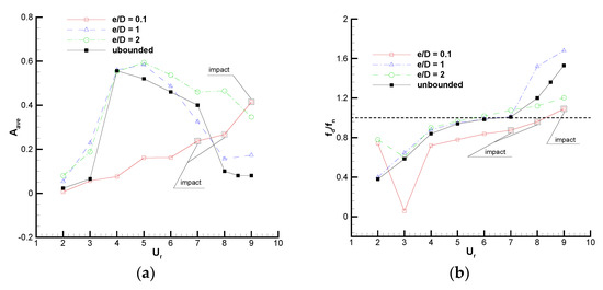 The variation of the non-dimensional amplitude and the predominant frequency of cylinder vibration with is presented in Figure 7, together with the results of the cylinder VIV in unbounded flows. In Figure 7a, it can be seen that the response amplitude in the case of is severely affected by the plane wall and it increases with . The cylinder-wall impact occurs at , which is marked in the figure. In the cases of and 2, the general trends of are similar to that in the unbounded flow and the response curves tend to have “initial”, “upper”, and “lower” branches. This is apparently due to the weaker effect of the wall. However, the maximum amplitudes of for and 2 are predicted at ; they are larger than that for the unbounded case predicted at . When , for and 2 are very close and the deviations become obvious when . It is interesting to find that when , the trend of for is much more similar to that in the unbounded case, even though the plane wall is farther away in the case of . A similar phenomenon is found for (Figure 7b) as the lock-in region for and the unbounded case is while that for is broadened, which results in a large amplitude at . Chung [38] reported that the size of the lock-in region increases with a decreasing gap ratio. This difference between the present study and the previous work of Chung would originate from the different Reynolds numbers or wall kinematics, which play important roles in determining the vibration amplitude [39].
