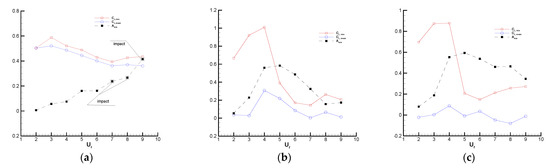 In order to understand how the hydrodynamic forcing causes the above amplitude response, Figure 8 presents two different statistics of the lift coefficients versus , including the root-mean-square value of the lift coefficient and the time-averaged value of the lift coefficient . To conveniently find the relationship between the amplitude response and the hydrodynamics, is also plotted in the figures. It can be seen that the peaks of for all three differ from the points where the maximal values of occur. Impact with the wall in the case of causes the trend of to be changed. So, it can be guessed that must approach the maximal value where the impact has the potential to occur. The curves for show that the small-gap-ratio case acquires a higher than the large-gap-ratio one in the entire range of computed . For , decreases with the increasing , almost in the entire computed range, except for the reduced velocities where impact occurs. The above regularities found for are consistent with those by Chung [38]. However, for a larger ( or 2), the overall trend of is that it increases in the range of and decreases beyond .