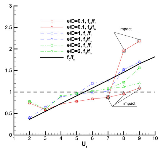 The vibration frequency is also a major concern with regard to structure fatigue and noise generation. So, it is worth it to explore the relation between the frequency of hydrodynamic force and cylinder vibration. Figure 9 shows the variation in the predominant frequency of cylinder vibration and hydrodynamic force with for three gap ratios, in comparison with the straight line representing the Strouhal frequency of an isolated stationary circular cylinder at , . For , in the range of . However, deviates from at and 9. A similar deviation can be seen in the work of Chung [38] for the large-gap-ratio case. In addition, it is predicted that in the low- part and in the high- part. For , exceeds in the whole range of and deviates from at and 7, i.e., the high- part in the lock-in region. For , and are the same as before while is considerably larger than and at and 9, where approaches . The case in [40] with and , which is analogous to the present case with and , also shows that is considerably larger than in the lock-in region. This may be due to the impact between the cylinder and the plane wall.