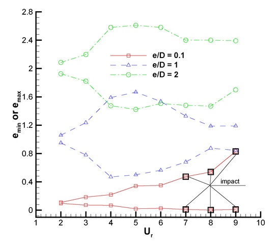 The minimal and maximal gaps, and , encountered through the course of cylinder vibration for three are presented in Figure 10. It is observed that the vibrating cylinder can move to positions very close to the plane wall in nearly the whole range of and increases with the increasing of the current considered range in the case of . Two conclusions can be obtained from the figure. One is that and increase with an increasing gap ratio. This is easy to explain as the effects of the wall on the cylinder are decreased with larger gap ratios. The second is that a larger always accompanies a smaller in the lock-in region for all the three cases with a different .