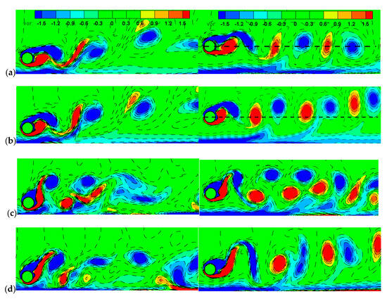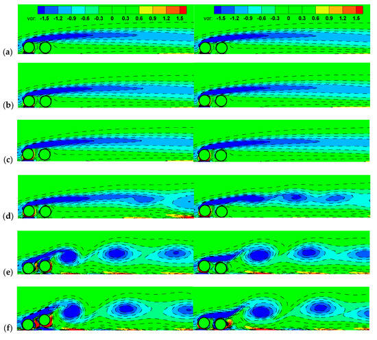 Figure 16 shows the vorticity contours in the wake at various values for when the displacement of the left cylinder center or right cylinder center nearly reaches a local minimum during the vibration cycle, corresponding to the left or right column in the figure, respectively. For when the amplitudes of the cylinders are almost zero, the shear layer of the front cylinder encloses the two cylinders and exhibits no fluctuations in the wake, leading to a stable state. The gap-side shear layer is suppressed by the near-wall effects, so only a single and elongated freestream-side vortex exists in the wake. At , the cylinders vibrate slightly and the elongated freestream-side shear layer is broken and the boundary layer of the plane wall is induced to be separated. As increases and the cylinders vibrate obviously, periodically shedding negative and positive vortices can be seen in the wake, even though the intensities of the positive ones are lower than the negative ones due to the suppression of the plane boundary layer (Figure 16e,f).