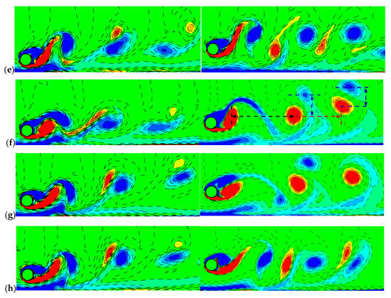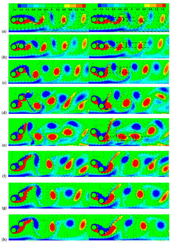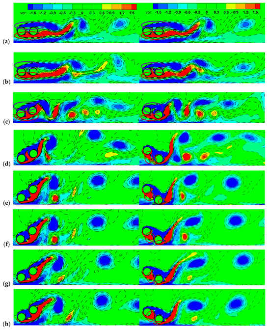 Figure 17 shows the vorticity contours for when the displacement of the left cylinder center or right cylinder center nearly reaches a local minimum during the vibration cycle, corresponding to the left or right column in the figure, respectively. It can be seen that the vortices freely shed from both sides of the rear cylinder. Due to the suppression of the plane boundary layer, the gap-side vortices quickly dampen out in the wake. When the amplitude of the rear cylinder becomes large, the vortex shedding pattern tends to be 2P (Figure 17c–h) near the rear cylinder. From the right column, the shear layer of the front cylinder encircles the rear cylinder at (marked by the circle in Figure 17a–c) while the gap-side shear layer impinges on the rear cylinder and splits into two parts at (marked by the circle in Figure 17d–h). This is due to the small gap between the rear cylinder and the plane wall in the lock-in region, which leads to strong interaction between the gap-side shear layer and the plane boundary layer.
