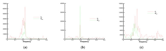 FFT of lift coefficient and displacement to the physical time for . (a); (b) ; (c) .