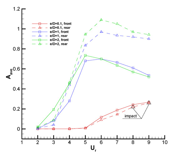 (3) Compared to the one-isolated-cylinder case, the vibrations of the cylinders are suppressed and the collision with the wall only occurs for the rear cylinder when is small. In addition, the vibration amplitudes of the front and rear cylinders are both larger and the lock-in region is obviously broadened.